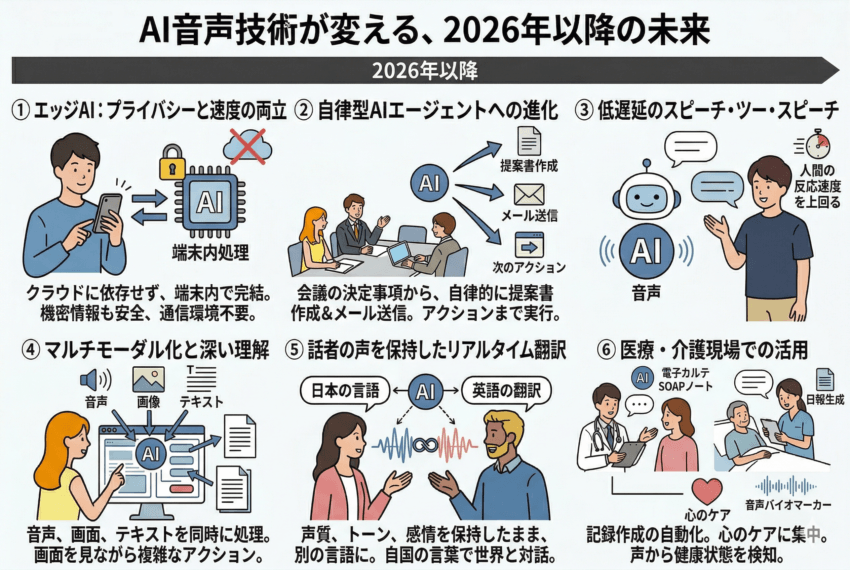 AI音声技術の進化は、事務作業の効率化に留まらず、あらゆる現場のあり方を変えていく。2026年以降の未来には、以下のような展望が広がっている。